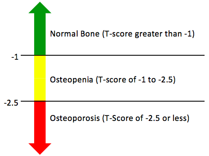 As noted in a previous post, “your T-score compares your bone density to that of a young healthy adult of your sex. It’s the number of units (standard deviation) that your bone density is above or below the average (mean). T-score is a valuable tool in the diagnosis of osteoporosis.