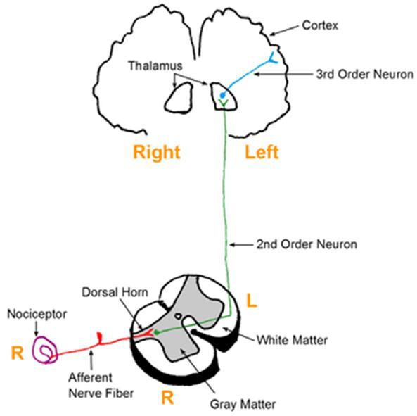- From the dorsal horn, the nerve elements within the gray matter of the spinal cord cross over to the other side of the spinal cord. Next, the pain information is transmitted upwards to the thalamus in the brain (2nd order neurons). Therefore, pain in the right hand is interpreted by the left side of the brain and vice versa.