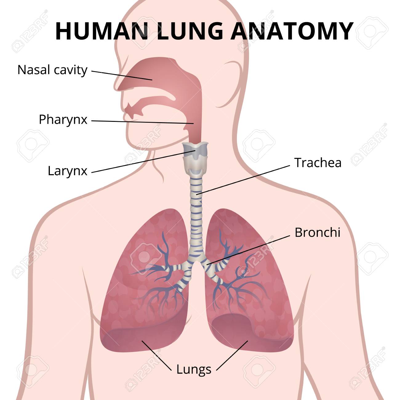 The lower respiratory system is the area below the larynx which includes the windpipe (trachea) and the lungs. When we inhale, air goes through the nose or mouth, inferiorly through the larynx and trachea on its way to the lungs. The air enters the lungs via the right and left bronchi which gradually decrease in size and end as alveloli, tiny air sacs. The alveoli are the areas where blood capillaries are found exchanging oxygen (O2) for carbon dioxide (CO2).