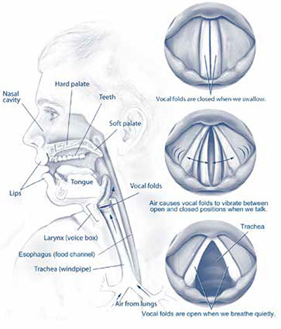 The voice box (larynx) is made of muscle, mucosa, and cartilage. It is located behind the Adam’s Apple. The vocal folds, or vocal cords contain muscle and mucosa. The vocal folds vibrate when air pressure generated by the lungs moves upward through the windpipe (trachea) to the undersurface of the vocal folds.